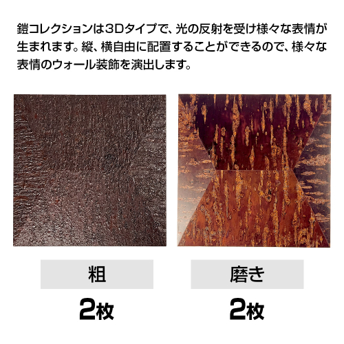 鎧コレクションは3Dタイプで、光の反射を受け様々な表情が生まれます。縦、横自由に配置することができるので、様々な表情のウォール装飾を演出します。