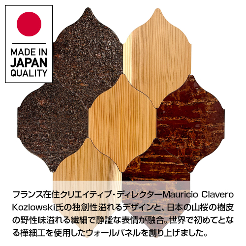 フランス在住、クリエイティブ・ディレクター、Mauricio Clavero Kozlowski氏の独創性溢れるデザインと、日本の山桜の樹皮の野性味溢れる繊細で静謐(せいひつ)な表情が融合。秋田から樺細工を使用したウォールパネルを創り上げました。