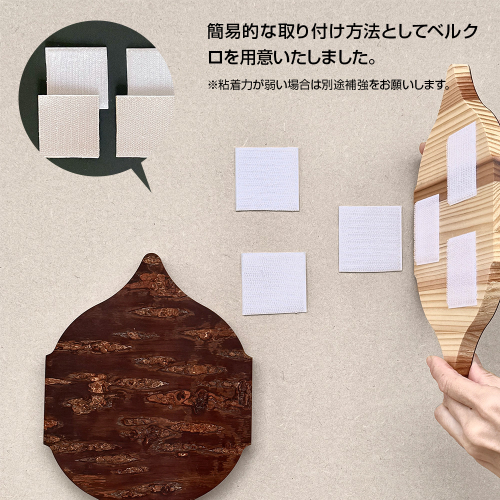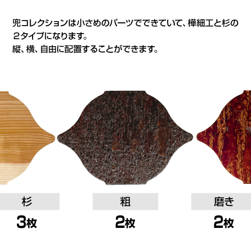 兜コレクションは小さめのパーツでできていて、樺細工と杉の2タイプになります。縦、横、自由に配置することができます。
