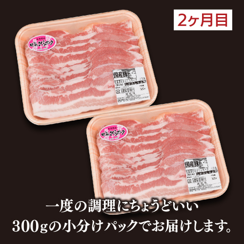 2カ月目:《しゃぶしゃぶ用》 やわらかくて甘みのある脂が楽しめる豚肉をしゃぶしゃぶや肉巻きおにぎりなどにピッタリの薄さにスライスしました。調理がしやすいよう300gの小分けにしてお届けいたします。