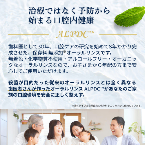 ALPDC液体タイプは、自然成分で口腔内の悪玉菌を選択的に減少させるマウスウォッシュです。