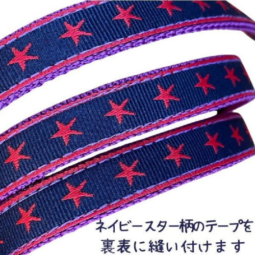 表はおしゃれな星柄のジャガードテープを縫い合わせました。土台は紫色のテープ。