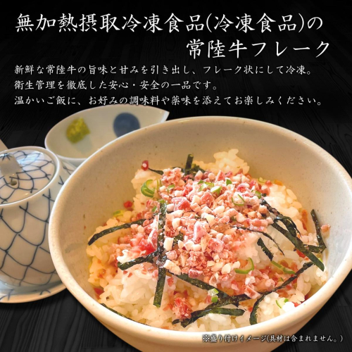 【茨城共通返礼品】 無加熱摂取冷凍⾷品(冷凍⾷品)の常陸⽜フレークです。 特殊加⼯を施し、⽜⾁本来の旨味と⽢みが多い茨城県産常陸⽜をフレークに商品化しました。 保健所指導の下で衛⽣管理を徹底した設備管理、器具の整備、殺菌⽅法を衛⽣安全マニアルにて作り上げた商品です。 新鮮な⽜⾁を⾷⾁製品加⼯を施し、新鮮な状態で冷凍フレークした物です。 ほっかほっかのごはんにお好みの調味料(わさび醤油、焼⾁たれ等)やゴマ、ネギ等の薬味と⼀緒にお召し上がりください。