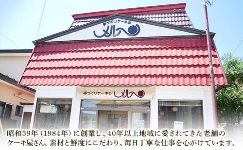 地元では「メルヘンといったらかぼちゃのケーキ」と言われるほど、長年愛されてきた定番のケーキです。遠方に住むご家族へ誕生日ケーキとしてお送りする方も多く、懐かしの味として多くのファンをもつ人気の逸品です。甘さ控えめの生クリームがお酒好きの男性にも好評で、店頭ではお酒のアテに購入する方もいらっしゃいます。
