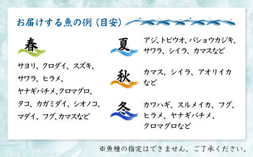 カワハギ、スルメイカ、フグ、ヒラメ、ヤナギバチメ、クロマグロなど