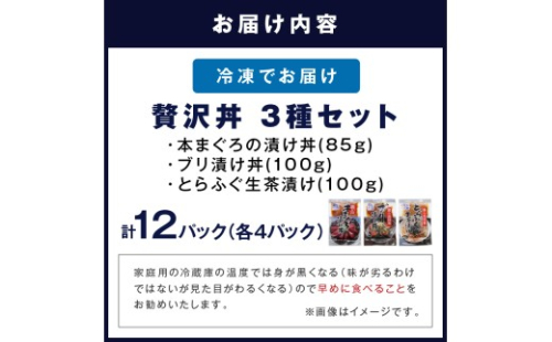 鷹島産本まぐろ・とらふぐ・ぶりの贅沢丼 3種セット[各4] ( 本マグロ 大トロ 中トロ 赤身 とらふぐ ブリ お手軽 丼 漬け 茶漬け 時短 )【C4-032】