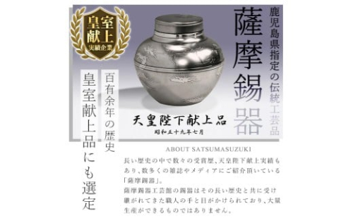 《100年以上の老舗店・薩摩錫器工芸館》 昔から錫は、入れた飲み物の雑味を抜いて味をまろやかにすると言われてきました。 毎日の晩酌のお供に錫器のぐい呑みはいかがでしょうか? 上質な素材と美しいデザインのぐい呑みは、お酒が好きな方への贈り物にも最適です。 本商品は、錫器の重みと質感をより感じることのできる仕上がりとなっております。 湯呑のような形をしており、より和の温かみを感じることができます。 おいしいお酒を錫器と一緒にお楽しみください。 《地産理由》 市内で製造・加工された工芸品 薩摩錫器工芸館 株式会社 0995-45-0177
