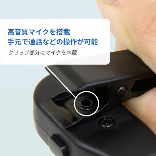 マイク部分には操作用のボタンがあり、マイクのオン/オフや通話/終話、音楽の再生/停止などができます。また、クリップ付きでお好みの場所に装着できます。