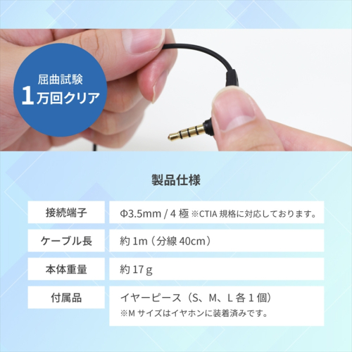 弊社独自の厳しい条件下で1万回の屈曲試験を行っても断線が見られなかった、耐久性の高いイヤホンです。またL字プラグが根元にかかる負荷を軽減します。