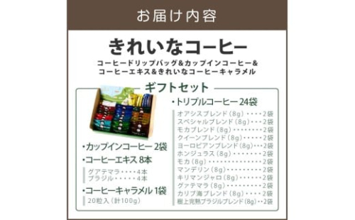 - ★特許製法★きれいなコーヒードリップバッグ24袋&カップインコーヒー2袋&コーヒーエキス8本&きれいなコーヒーキャラメル ギフトセット【A8-090】