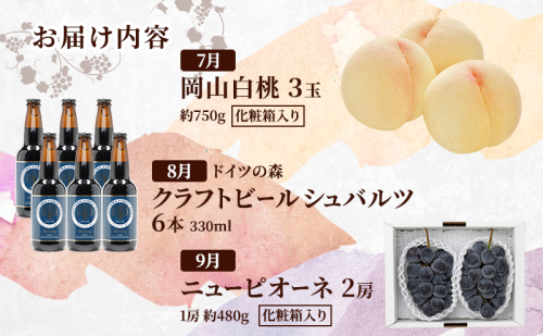 - 定期便 2026年 先行予約 ドイツの森の人気商品と岡山の人気果物 堪能 5回コース 桃 白桃 ビール ぶどう ピオーネ シャインマスカット ドイツの森 ソーセージ 赤磐市
