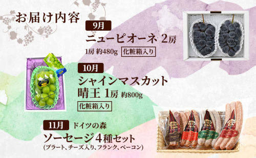 - 定期便 2026年 先行予約 岡山の人気果物とドイツの森の人気商品 厳選 3回コース ぶどう ニューピオーネ シャインマスカット 晴王 ソーセージ 赤磐市