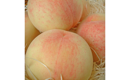 少し紅色を帯びた、見た目にも美しい姿。緻密で繊維が少ない肉質で、酸味は少なく、甘みが口いっぱいに広がります。果汁が多く、ぼたぼたと滴るジューシーな白桃です。
