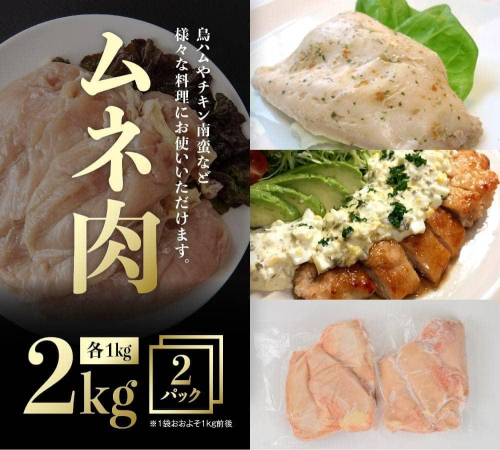 ムネ・ササミ、手羽元は各2kg入りです。(※おおよそ1kg前後ずつ2袋に分けております。2袋合計で2kgとなりますのでご注意ください。)