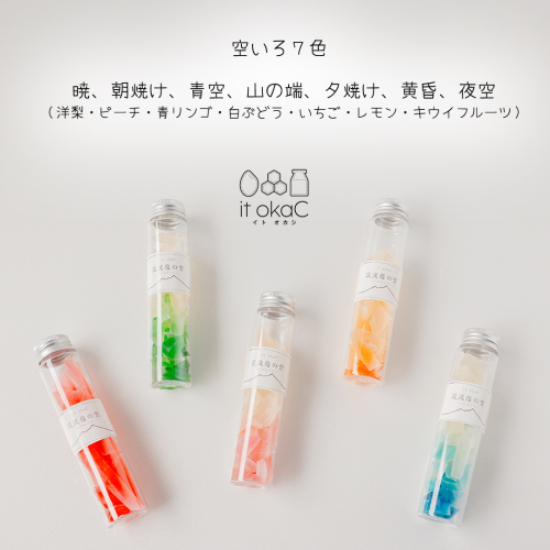 1日の内で変化する空いろ「暁・朝焼け・青空・山の端・夕焼け・黄昏・夜空」を表現しました。