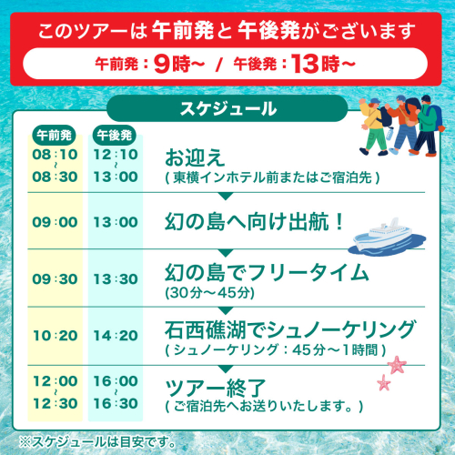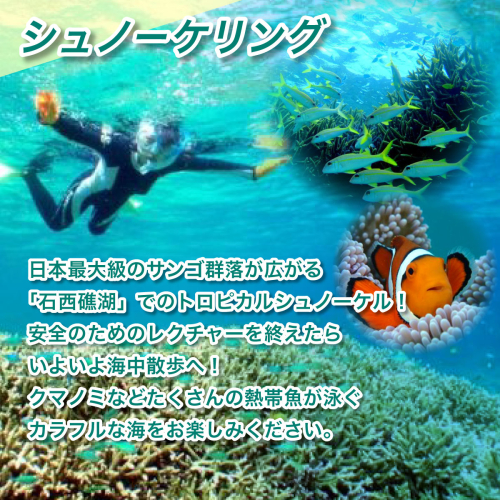 石垣島市街地からの送迎があり、シュノーケリング初心者でも参加可能です。午前と午後のコースがあります。