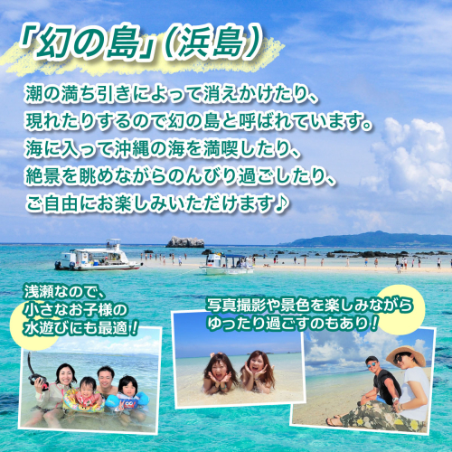 幻の島は、石垣島と西表島の中間に位置し、潮の干満により姿を現す砂浜で、白い砂浜と透明度の高い海が特徴です。