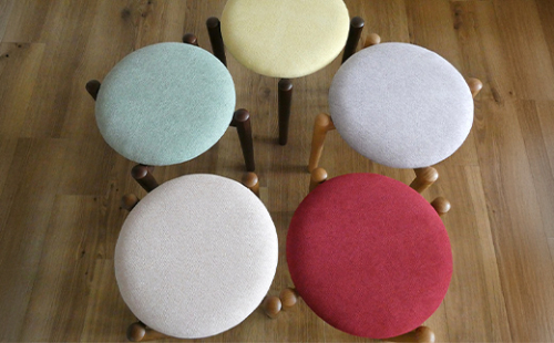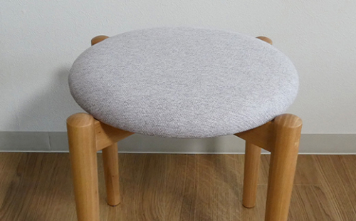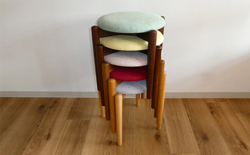 丸いデザインのクッション性のある座面に、北海道産エルム無垢材の脚部を組み合わせたかわいいデザインのスタッキングスツールです。