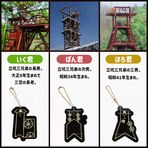 三笠市の炭鉱時代に活躍した現存する3つの立坑櫓を、完成した順に三兄弟のキャラクターにしました。三笠ジオパークの認定品として認められています。