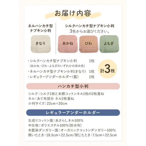 - 布ナプキン ナプキン コットン 小判スターターセット 選べるカラー あかね びわ よもぎ シルクハンカチ型 ネルハンカチ型 レギュラーアンダーホルダー 計3枚 有限会社アルデバラン《45日以内に出荷予定(土日祝を除く)》岡山県 笠岡市 オーガニックコットン 布ナプキン 基本セット