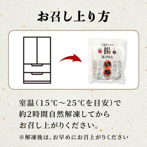 昔なつかしの味! 世代を超えて愛される「元祖揚げもち」をお届けします。 風味豊かな海苔と、甘辛く仕上げた特製の醤油だれが絡み合う、昔ながらの味わいです。 お餅をカリッと揚げているため、外はサクッと香ばしく、中はもっちりとした食感が楽しめます。 お子様のおやつにも、お茶請けにもぴったりの、どこかほっとする味わいを、ぜひこの機会にご賞味ください。 本返礼品は茨城県北茨城市との共通返礼品となっております。 【お召し上がり方】 室温(15℃~25℃を目安)で約2時間自然解凍してから お召し上がりください。 【内容量】 3本入り×5袋 【アレルギー】 小麦・大豆 【消費期限】 13ケ月 【保存方法】 冷凍保存 【申込期日】 通年 【発送期日】 冷凍配送 入金確認後、3週間~1ヵ月程度で発送 ※クール便対象 配送できない地域がございます※   ・伊豆諸島:青ヶ島村(青ヶ島)・利島村(利島)・御蔵島村(御蔵島)・式根島 ・小笠原諸島:小笠原村(父島・母島・硫黄島・南鳥島など) 【商品提供】 有限会社佐々木食品 【注意事項】 解凍後は、お早めにお召あがりください。 地場産品類型:8-イ 類型該当理由:北茨城市から共通返礼品に提供する同意を得ているため