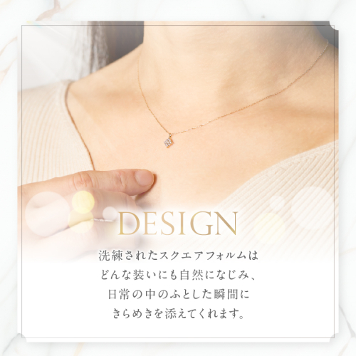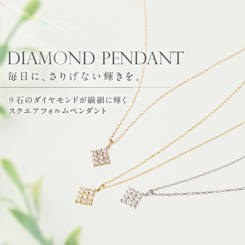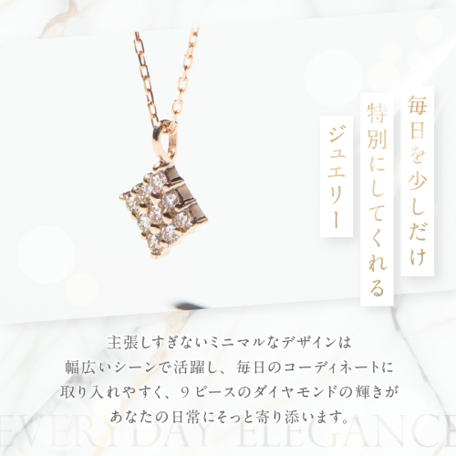 洗練されたスクエアフォルムに、厳選された9石のダイヤモンドが繊細に輝くペンダント。