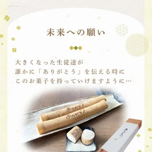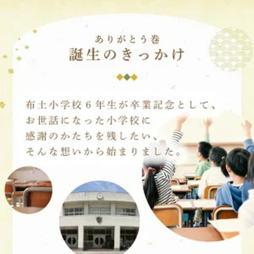 「ありがとう巻」は、地元・布土小学校の6年生たちと老舗和菓子店が共同開発した特別な大砲巻です。