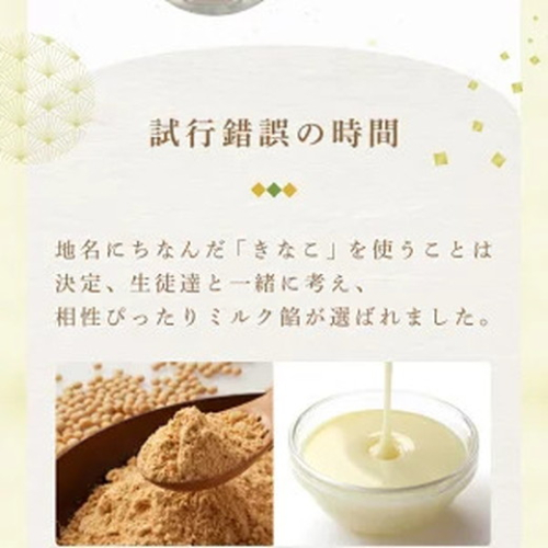 白餡とミルクを絶妙に合わせたなめらかな餡を包み込み、仕上げにきなこをまぶしました。きなこの風味とミルク餡のやさしい甘さが調和する、どこか懐かしい味わいです。