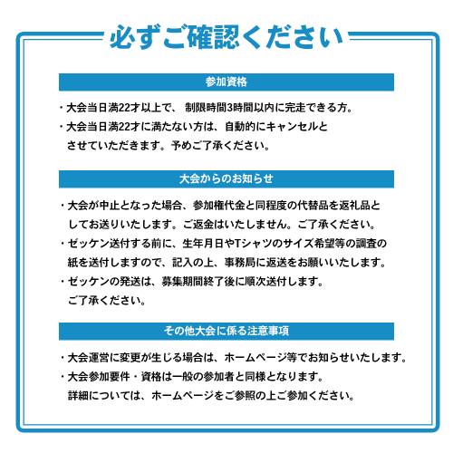 〇大会当日満22才に満たない方は、自動的にキャンセルとさせていただきます。予めご了承ください。