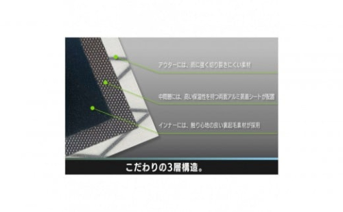 外側には切り裂き強度が高く、雨にも強い撥水素材。中間層には、保温性の高い両面アルミ蒸着シート。インナーには、手触りの良い裏起毛素材。こだわりの3層構造です。
