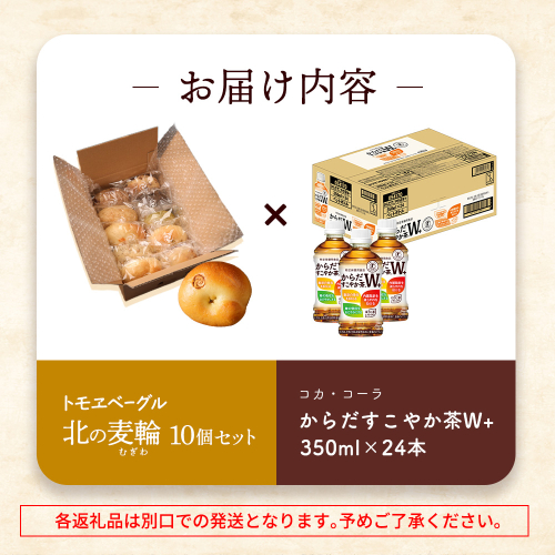 からだすこやか茶W+ 350ml×24本 トモヱベーグル 北の麦輪 10個セット | ふるさと納税 北海道 恵庭 からだすこやか茶W トクホ お茶 ヘルシー 健康茶 脂肪 内臓脂肪 食事 飲料 北の麦輪 ベーグル パン 人気店 天然酵母 小麦 詰め合わせ セットもっちり お取り寄せ ワンストップ マイページ コラボ商品 恵庭市