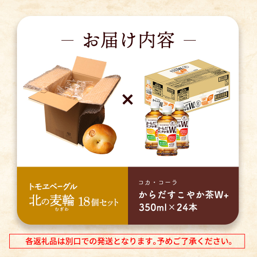 からだすこやか茶W+ 350ml×24本 北の麦輪 18個セット | ふるさと納税 北海道 恵庭 からだすこやか茶W+ トクホ お茶 ヘルシー 健康茶 脂肪 内臓脂肪 飲料 北の麦輪 ベーグル パン 天然酵母 小麦 詰め合わせ セット お取り寄せ ワンストップ マイページ コラボ商品 恵庭市