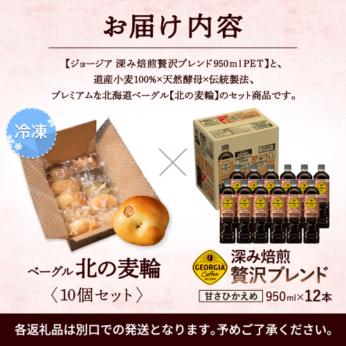 ジョージア「深み焙煎贅沢ブレンド 甘さひかえめPET」950ml×12本とトモヱベーグル「北の麦輪」10個セット【C99025】