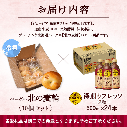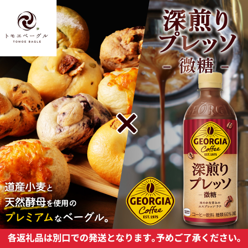 - ジョージア「深煎りプレッソ 微糖PET」500ml×24本とトモヱベーグル「北の麦輪」10個セット【C99027】