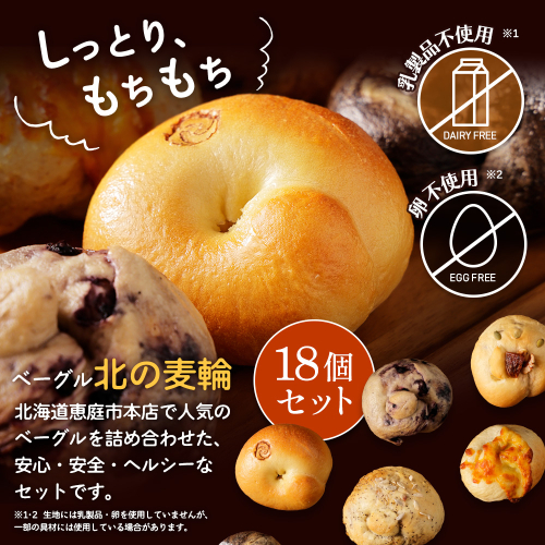 北海道産小麦と天然酵母で作る、外はしっかり中はもっちりのベーグル。恵庭本店の人気商品を詰め合わせた、安心・ヘルシーな「北の麦輪」セットです。