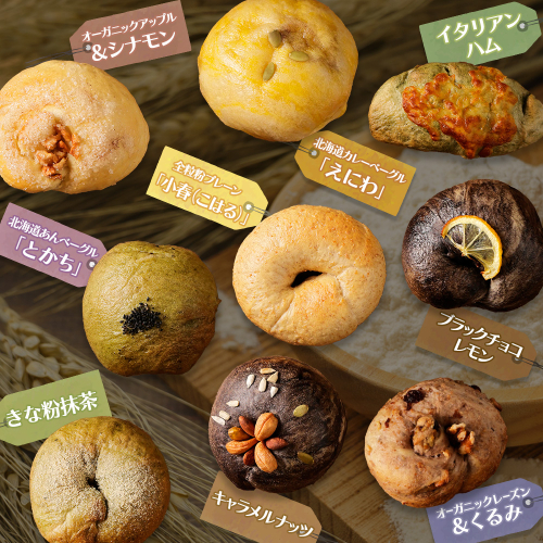 プレーンベーグル「巴(ともえ)」, クリームチーズブルーベリー, バジルソーセージ, 有機アールグレイ&レモン, オーガニックイチジク&くるみ, オーガニックチョコレート, キャラメルコーヒー&有機チョコ, 抹茶ホワイト, ダブルチーズ, オーガニックレーズン&くるみ, オーガニックアップル&シナモン, イタリアンハム, 北海道カレーベーグル「えにわ」, 北海道あんベーグル「とかち」, 全粒粉プレーン「小春(こはる)」, ブラックチョコレモン, キャラメルナッツ, きな粉抹茶
