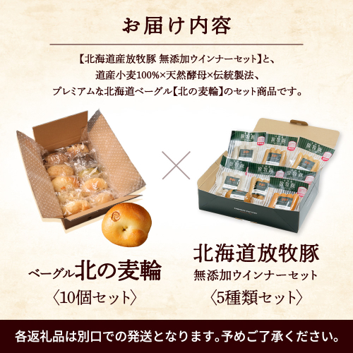 北海道産放牧豚 無添加ウインナーセットと、道産小麦100%×天然酵母×伝統製法、プレミアムな北海道ベーグル北の麦輪のセット商品です。