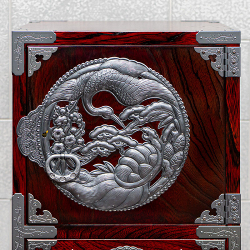 今回ご紹介する35巾脚付すきまチェストは、特別仕様として片開き扉に彫金手打の金具を採用。彫金師が鉄板や銅板に、たがねと金づちで一打一打打ち込んで文様を描く、昔ながらの手仕事による逸品です。