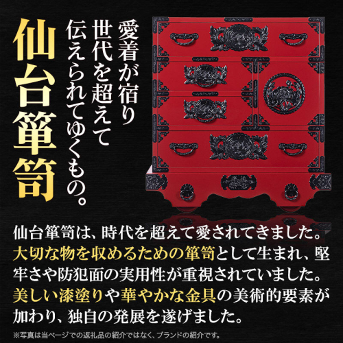 ■地場産品に該当する理由:宮城県の伝統工芸品である仙台箪笥を町内にて企画・デザイン、組み立て、金具装着、磨き、最終仕上げまでの全ての工程を行っている。