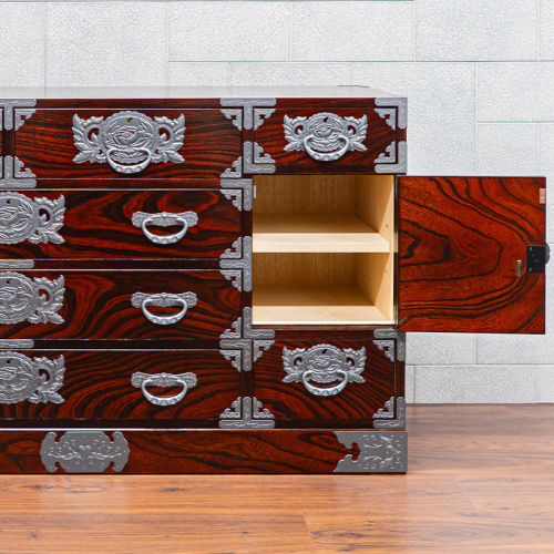 今回ご紹介する四・五尺横長箪笥は、片開扉に彫金手打の金具をお付けした特別仕様です。