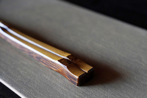 根に近い部分の材を職人が見極め、茶杓職人が丁寧に削り上げた後、摺り漆で飴色に仕上げています。