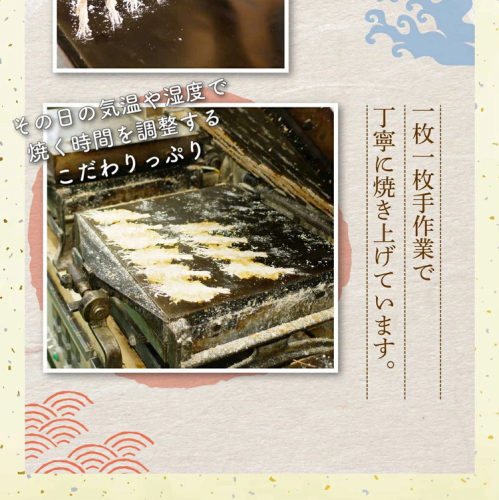 一枚一枚、その日の気温や湿度に合わせて焼き加減を調整する昔ながらの製法は、熟練の職人だからこそできる技。