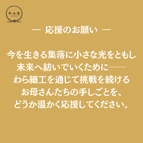 霊峰鳥海山の伏流水に恵まれた米処秋田県にかほ市で栽培された稲わらを、海風山風にあてて丁寧に自然乾燥した稲わらを使用し、高原の集落「釜ヶ台」の女性たちが冬の手仕事として作り上げたわら細工です。この「祝酉 鳥海福寿」には、手に取ってくださる方が福をたくさん取り込めますようにという祈りが込められています。お部屋のインテリアとして暮らしの中でそっと寄り添う存在になれたら幸いです。