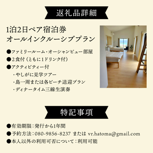 ヴィラ竜宮城鳩間 1泊2日 ペア宿泊券 オールインクルーシブプラン(ファミリールーム・オーシャンビュー部屋)