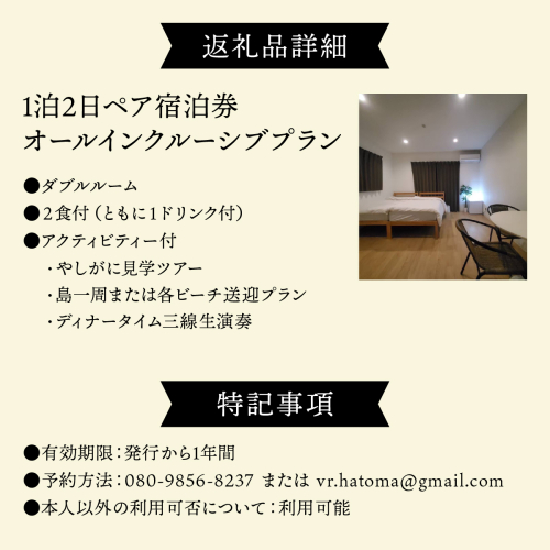 ヴィラ竜宮城鳩間 1泊2日 ペア宿泊券 オールインクルーシブプラン(ダブルルーム部屋)