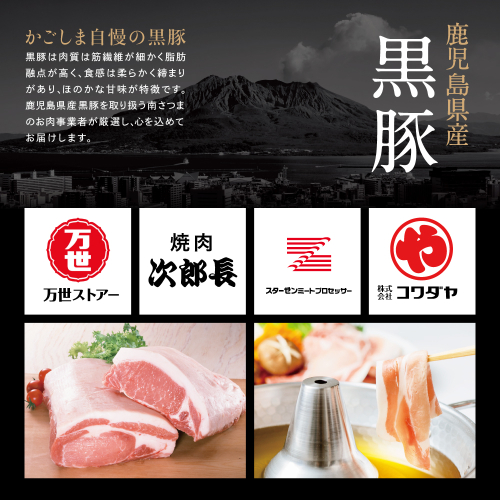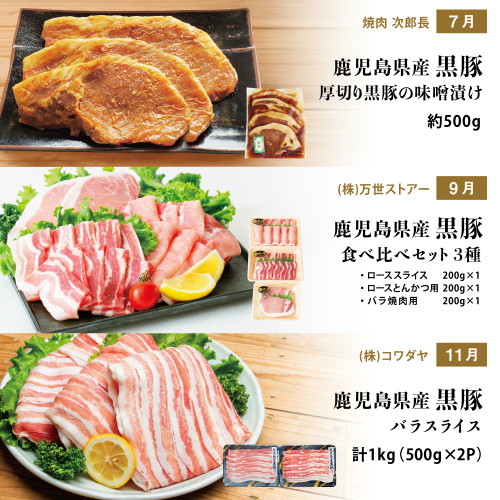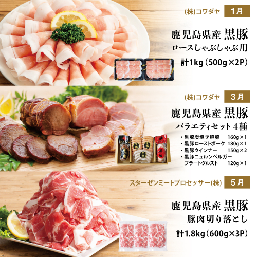 - 【定期便】畜産王国鹿児島の厳選黒豚定期便(全6回)お肉 国産 鹿児島県産 豚肉 しゃぶしゃぶ とんかつ 焼肉 焼き肉 切り落とし 焼豚 チャーシュー ローストポーク セット 食べ比べ コワダヤ スターゼン 万世ストアー 焼肉次郎長 南さつま市