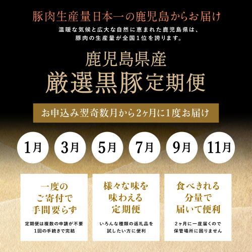 畜産王国鹿児島の厳選された黒豚を1年を通じて全6回お届けする定期便。
