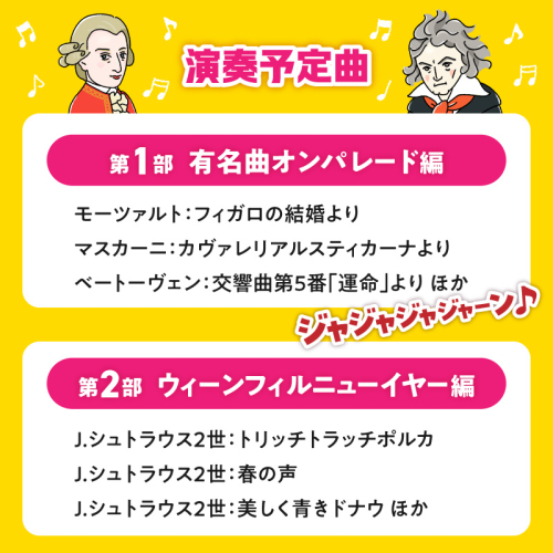 最初から最後までお馴染みの楽曲の演奏とおもしろ司会で飽きることなく楽しい時間を過ごせるコンサートです。