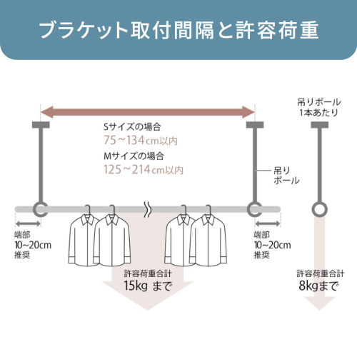 ・許容荷重:吊ポール:1本あたり:8kg、ハンガーバー:全体15kg、吊り下げ物1個当たり3kgまで
