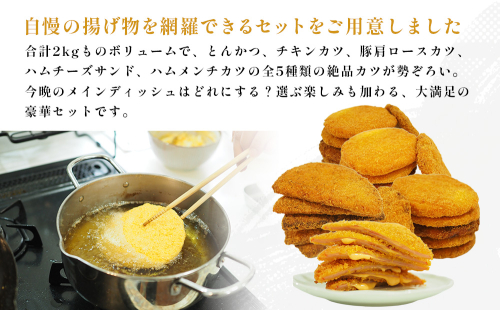 合計2kgものボリュームで、とんかつ、チキンカツ、豚肩ロースカツ、ハムチーズサンド、ハムメンチカツの全5種類の絶品カツが勢ぞろい。